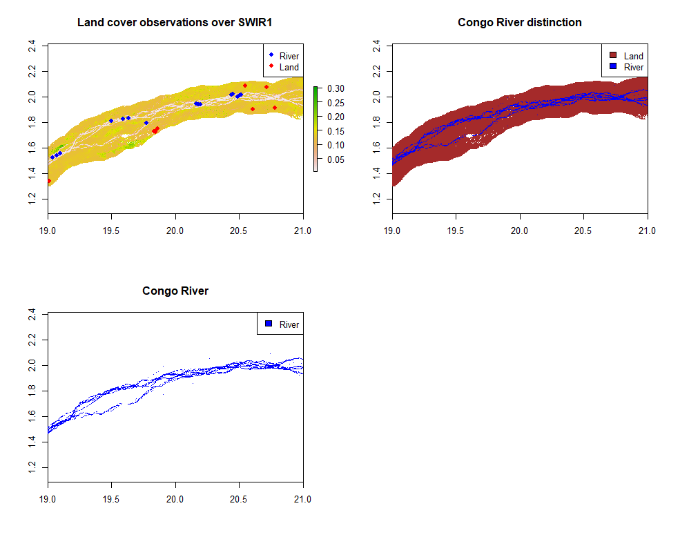 To distinguish the river in satellite images and avoid the meaningless model application on land pixels, a supervised classification has been realised (the algorithm considered the two SWIR bands to be the most useful for this distinction).
