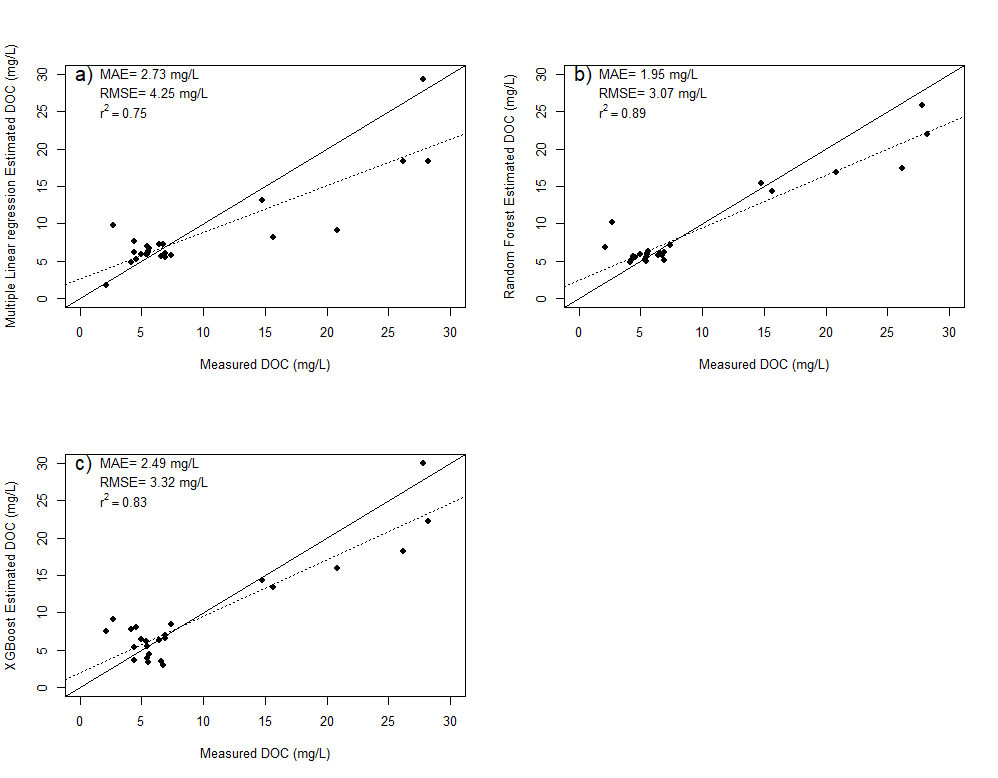 For all retrieval models, the dataset was randomly separated into two subsets for training (85%) and testing (15%). Two different algorithms of machine learning have been used to retrieve DOC: Random Forest (RF; Breiman, 2001) and extreme gradient boosting (XGBoost; Chen et Guestrin, 2016). Both are learning algorithms based on the development of decision trees. As input features were used the six bands, Green over Blue (GoB), Green over Red (GoR) and Blue over Red (BoR) ratios (ChunHock et al., 2020) and Normalized Difference Water Index (ndwi), Modified Normalized Difference Water Index (Mndwi) and New Water Index (nwi) (Khalid et al., 2021). The performance of these two algorithms was also compared to a simpler multiple linear regression (MLR) model already used for DOC retrieval and adapted from Cao and Tzortziou (2021):