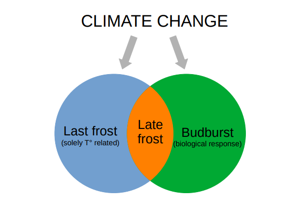 During my thesis, I was interested in predicting how the risk of late frosts will evolve in the context of climate change for Walloon forests. Late frosts, also called spring frosts, are frosts that occur after budburst (unfolding of leaves, fruits and flowers in spring) when trees are particularly sensitive. Unexpectedly, climate change, although primarily a warming, has the potential to increase the risk and damages from such events. Indeed, not only climate change acts on frost (purely in terms of temperature) but also on the timing of budburst because the trees try to take advantage of warming by making their budburst earlier in the year. Therefore, an increasing risk of late frosts is not incompatible with global warming. In fact, some scientific studies predict an increased late frosts risk in certain regions of the world even if these regions will face a warming! In the end, late frost risk evolution depends on the relative advancement of the last frost of the year date and the burdburst date. If the last frost date is brought forward slower than that of bud burst, then the trees find themselves at a stage of development that is too advanced (compared with the surrounding temperature) and the risk of potentially damaging late frosts increases. To sum up, climate change affects two elements, one wich tends to increase the risk while the other one tends to decrease it. The question is which one is dominant.