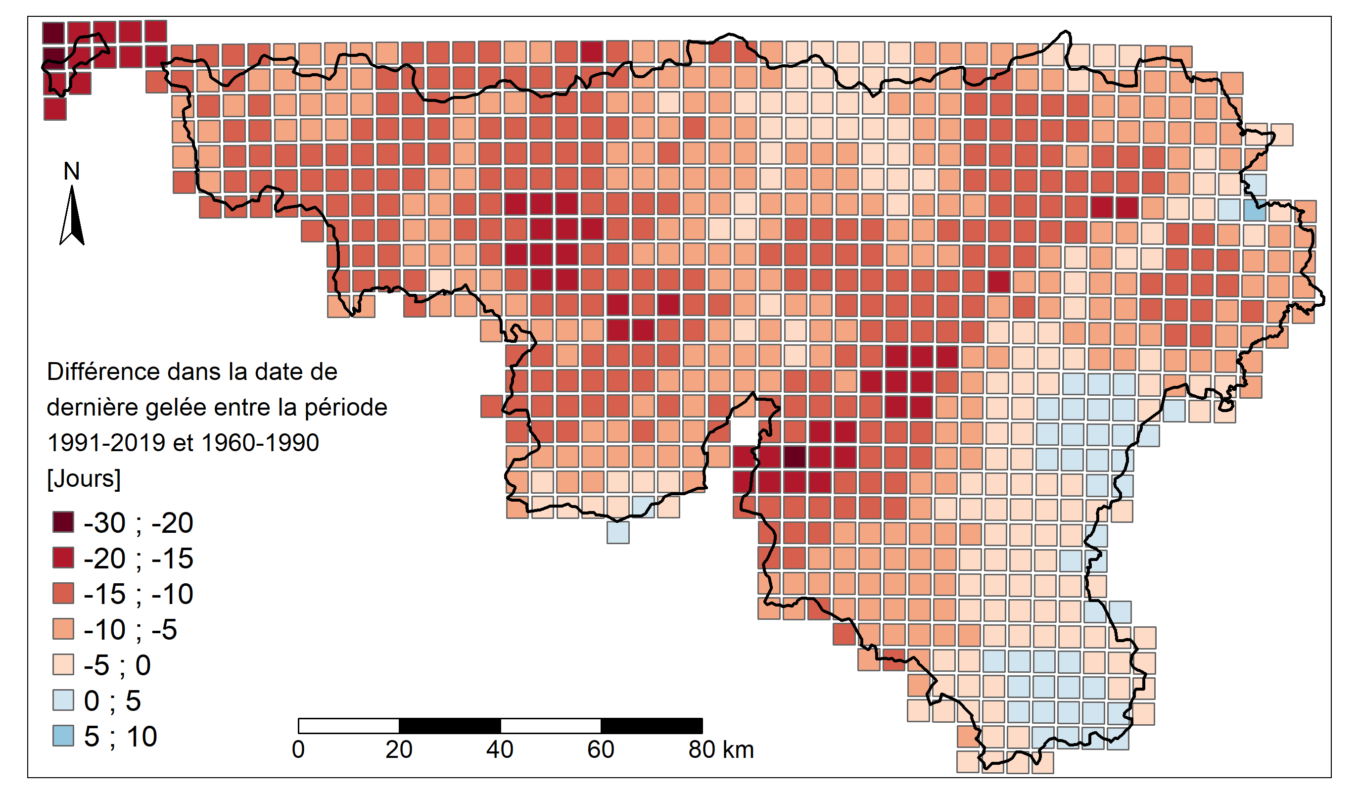 The first figure shows the difference in date of the last spring frost (temperature below 0°C) between the period 1991-2019 and the period 1960-1990 [Days] (source of raw data: IRM, 2018). Positive (negative) values indicate a later (earlier) last frost date. Unsurprisingly, the general trend is toward an advancement in the year of the last spring frost (8.4 days on average). A few exceptions are notable in Eastern Wallonia. It should be noted that this variable is partially correlated with the evolution of the average temperature. However, extreme events, such as the last frosts of the year, are also affected by changes in temperature variability and distribution. This map therefore provides information that would not be visible with the evolution of the average temperature!