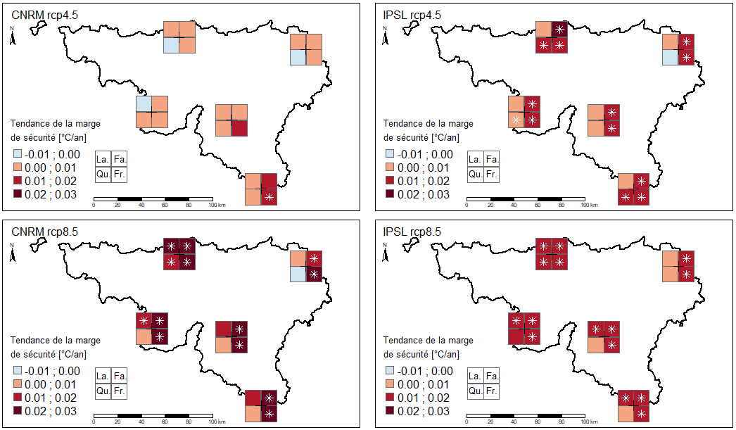 Finally, the following maps make it easy to assess the effect of each variability factor (models, scenarios, species and locations). These maps indicate the safety margin trend [°C/year] for five different locations. It seems that the effect of location is weak compared to the other variability factors. The most important result is the fact that no simulation showed a significant downward trend in the safety margin. The simulations are either significantly positive (decreasing risk) or nonsignificant. In the end, in our regions, forest late frosts are and should remain very rare and localized events in the future. It is unlikely that the climate change will have an effect on late frosts, the direction and amplitude of which should worry Walloon foresters.