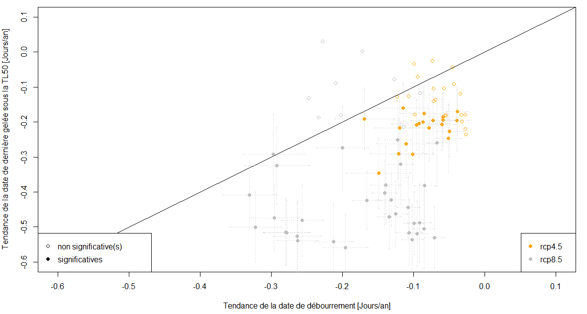 Predicting the future evolution of the risk of late frosts was the main objective of the thesis. Even considering many uncertainties, the results point to a decrease in the risk of late frosts in Walloon forests with climate change. These results are reflected in the following figures, each emphasizing different variability factors. The first figure compares the evolution of the date of budburst [days/year] with the evolution of the date of the last frost (temperature below LT50) [days/year] between 2006 and 2100 on the basis of climate projections made by two different models and forced by two different warming scenarios (RCP 4.5 and RCP 8.5). Open dots indicate that at least one of the two trends was statistically nonsignificant. Full dots indicate that both trends were significant (p-value < 0.05). The dotted lines represent the standard error of regressions. It is clear that most of the simulations (and even more those that are statistically significant) show a greater advancement of the date of the last frost than of the date of budburst, which means that the risk should decrease in the future. This figure gives a first raw idea of the results but lacks details. However, the effect of warming scenarios is already visible. It seems that the stronger the warming, the more the risk should decrease.