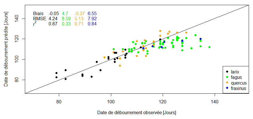 As I was interested in projections of the future, models were needed. Of course, an important element in the construction and use of models is their validation by comparing results with real observations. The following figure shows predicted budburst dates as a function of observed budburst dates [days], for four different tree species. It is clear that the model works well for some species (larix and quercus) with good visual grouping of points around the x=y line and good validation indices. However, the results are less good for the Fagus species for which the model seems to lack sensitivity. The number of observations of Fraxinus species was insufficient to draw firm conclusions.